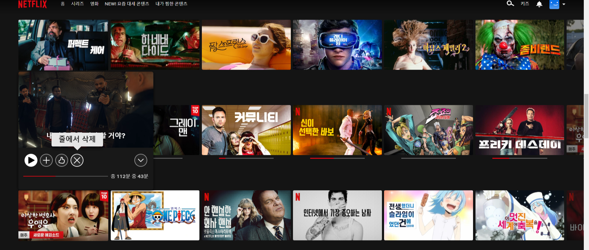 그 후 나타나는 메뉴에서 '줄에서 삭제'를 누르면 해당 콘텐츠를 시청한 내역이 사라진다.