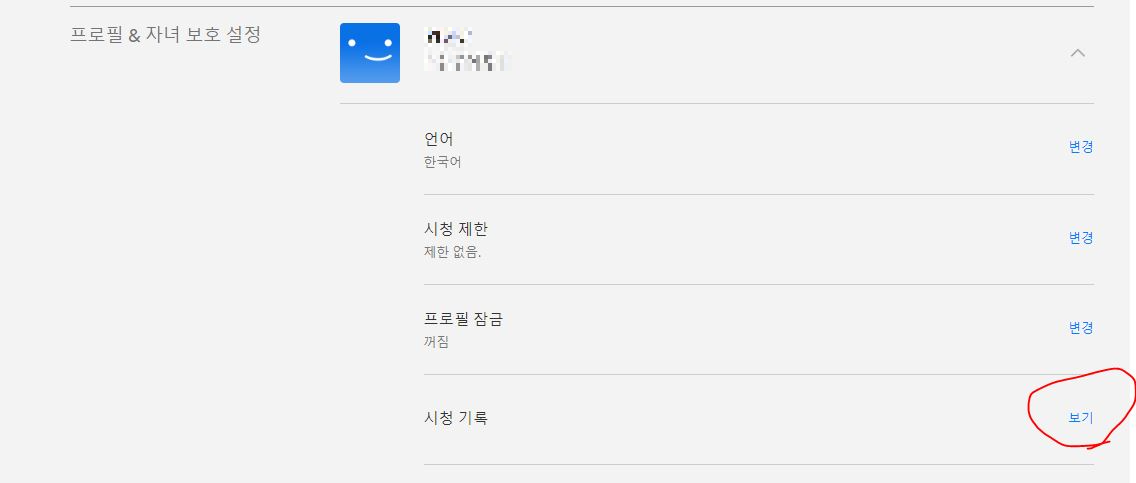 이렇게 나타나는 계정관리 화면에서 '시청기록'의 보기 버튼을 누른다.