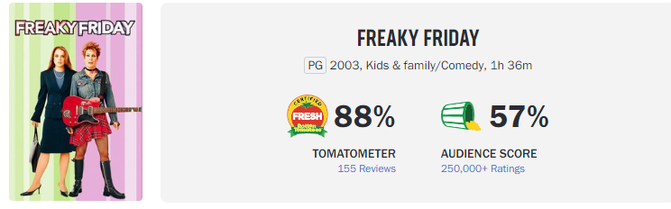 바디 체인지물을 보려고 한다면 ★★★★. 정작 넷플릭스만 봐도 <프리키 데스데이>라는 누가 봐도 이 영화의 오마주인 바디 체인지+호러물을 내걸고 있고, 그 외에도 1976년의 프리키 프라이데이 이후로 모든 바디 체인지물은 이 영화의 영향을 받았다고 해도 과언이 아니다. 하지만 1976년판은 지금 보기엔 많이 촌스럽고 지루할 수 있으니, 부담스럽다면 이 버전으로 시작해 보는 것도 좋다.