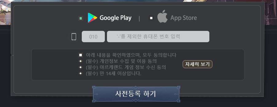 아래 내용을 확인하였으며, 모두 동의합니다 (필수) 개인정보 수집 및 이용 동의 (필수) 아르케랜드 게임 정보 수신 동의 (필수) 만 14세 이상입니다.