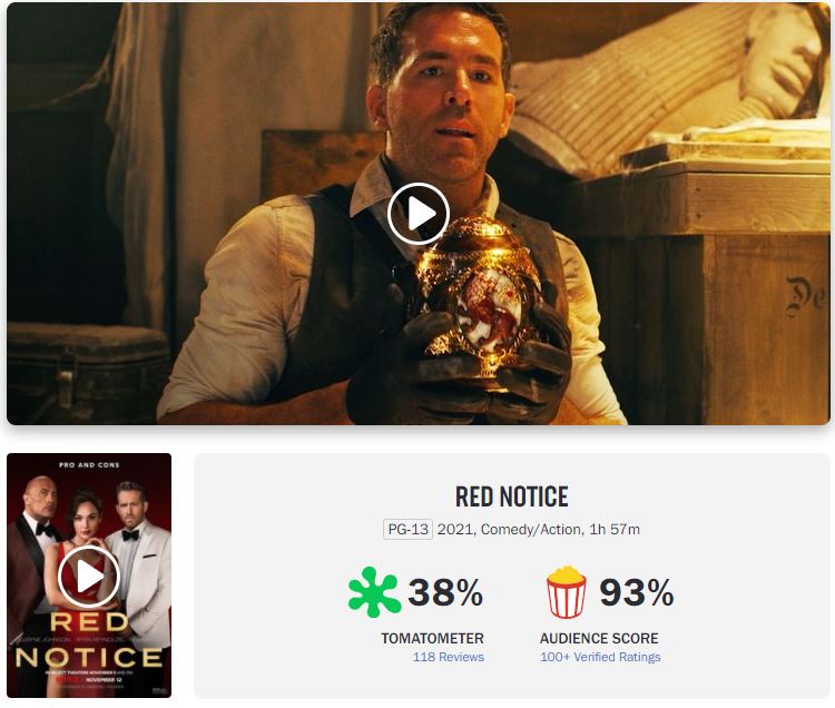 아무튼 전혀 PC하지도, 참신한 시도가 엿보이지도 않는 평범한 케이퍼필름인 레드 노티스는 로튼 토마토 지수 38%로 여지없는 썩토를 기록하며 한없이 처박히고 있다.