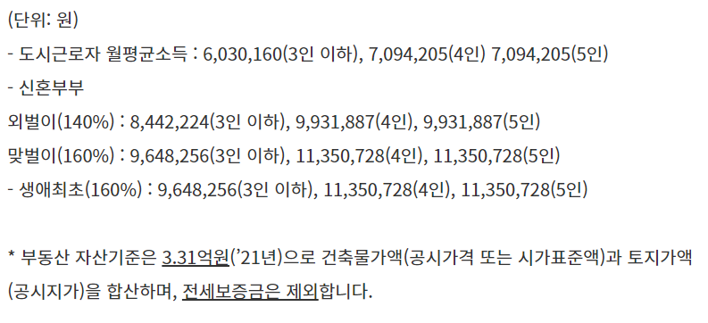 3. 해당 세대의 월평균 소득이 (1) 전년도 도시근로자 가구당 월평균 소득의 140%(배우자가 소득이 있는 경우 160%) 이내일 것 또는 (2) 전년도 도시근로자 가구당 월평균 소득의 140%(배우자가 소득이 있는 경우 160%)를 초과할 경우, 세대원이 소유하는 부동산 등 가액의 합계가 약 3.3억원 이하일 것