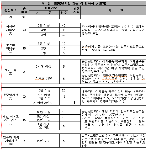 즉, 미성년 자녀가 많을수록, 그 중에서도 영유아 자녀가 많을수록, 무주택기간과 당해 지역 거주 기간이 길면 길수록 높은 배점을 받습니다.