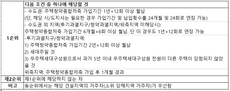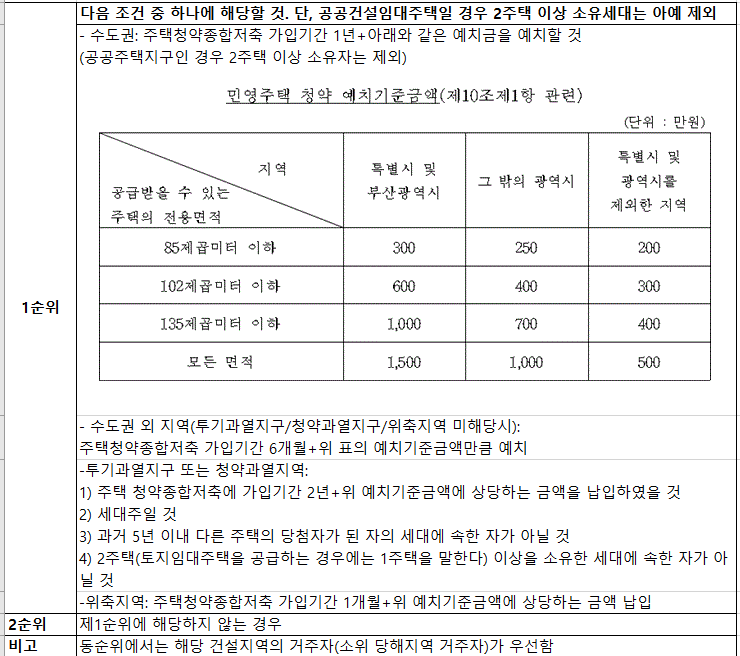 이 때 국민주택인지 민영주택인지에 따라서 아래와 같이 1순위/2순위 청약자가 구분됩니다.