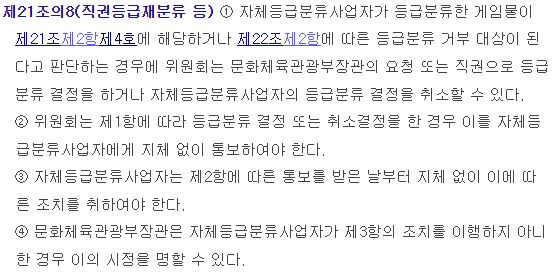 여기서의 제21조 제2항 제4호와 제22조 제2항은 다음과 같은 내용이다. 즉, 다음 사유가 있으면 자체등급분류사업자가 이미 등급분류를 한 게임이라도 게임물관리위원회가 직권으로 등급재분류를 할 수 있다.