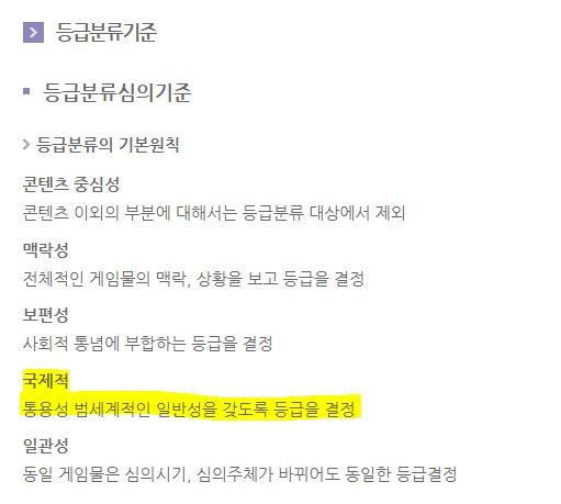 (심지어 게임물관리위원회 홈페이지 내 등급분류제도의 설명에 따르면 '국제적 통용성'을 갖는 등급분류기준을 활용해야 한다고 적시하고 있으므로 이는 본인들의 등급분류제도 취지조차도 몰각한 한심한 답변임)