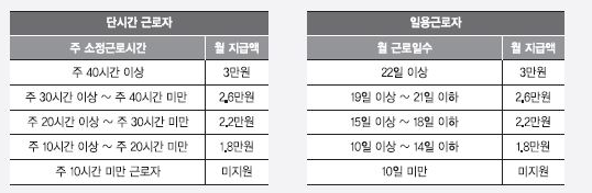 - 지원 수준: 사업장 규모 불문 1인당 월 3만원