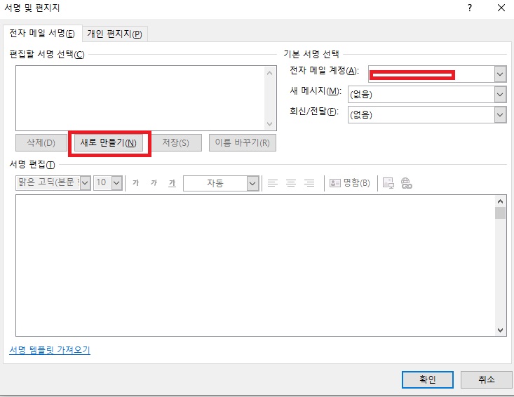4. 서명 설정란에서 새로 만들기를 누른다. 기존 서명이 있는 경우, 해당 서명의 이름을 선택하고 편집할 수도 있지만 새로 만드는 경우를 전제로 한다.