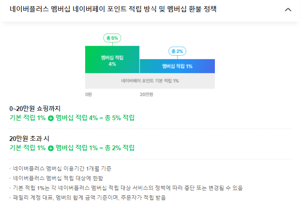 거의 사실상 무의미한 수준으로 포인트를 적립하는 카카오페이와는 달리 사실 이 정도도 충분히 후한 포인트지만, 네이버플러스 멤버십 가입시 특정 상품에 한해 최대 5%까지를 포인트로 적립해 준다.
