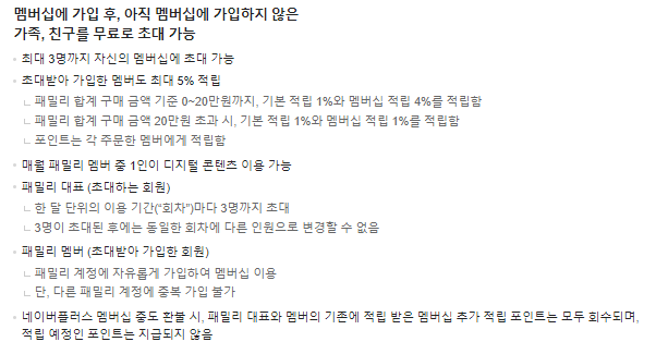즉, 본인만 가입하면 다른 사람들은 추가 요금 없이 아래에서 설명할 네이버플러스 멤버십 혜택 중 추가 적립 혜택을 함께 누릴 수 있다.