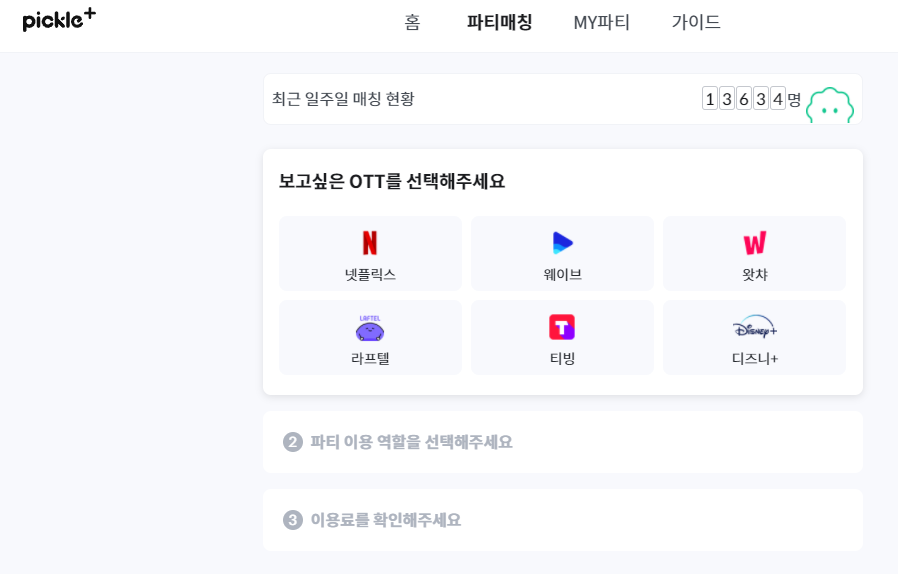 인터넷 커뮤니티 뿐만 아니라 전문적으로 이렇게 계정 공유를 원하는 사람들을 매칭시켜 주는 서비스도 존재한다. 피클(https://pickle.plus/) 이라는 서비스인데, 가입 후 자신이 원하는 OTT를 선택하고 자신이 계정주가 될 것인지 아니면 남의 계정을 공유만 받을 것인지 등을 선택하면 파티를 매칭시켜 준다. 보통은 최대 4인 정도까지 동시시청이 가능하니(넷플릭스 프리미엄 기준), 4명 파티를 구성하면 4,000원 조금 넘는 돈으로 구독이 가능한 것이다.