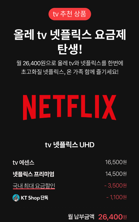 올레tv를 사용할 경우 넷플릭스 요금제를 월 26,400원의 가격으로 사용할 수 있다. 다만, 현재 공식 웹사이트상 넷플릭스 프리미엄의 인상된 가격이 반영되어 있지 않은 것 같은데(아래 공식 웹사이트 배너 참조), 이미 넷플릭스 프리미엄의 경우 14,500원이 아니라 17,000원으로 인상되었으므로 아래 가격이 그대로 유지되는지는 신청시 재차 확인해 볼 필요가 있다.