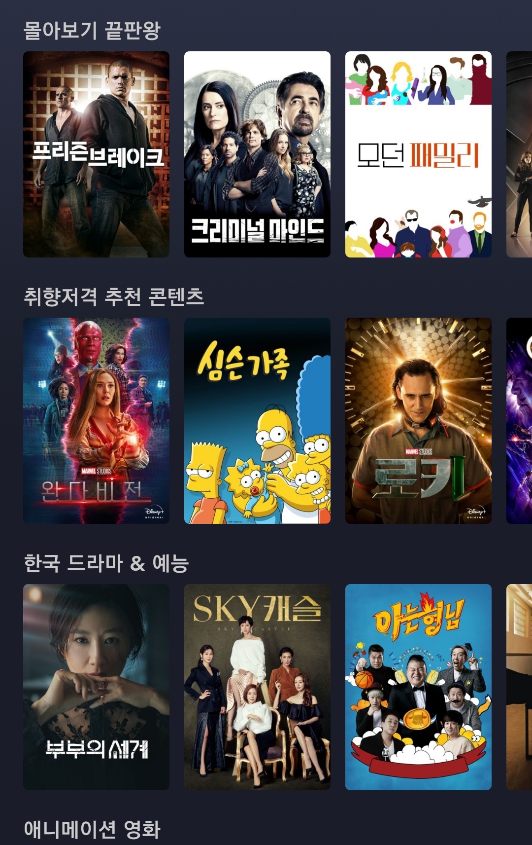 무엇보다도 다른 어떤 OTT에서도 볼 수 없는 오리지널 콘텐츠가 매력적이다. 현재는 MCU PHASE 4에 속한 완다비전, 로키, 팔콘과 윈터솔저 등이 대표작이다. 아마 조만간 넷플릭스에 나가있던 제시카 존스나 데어데블 등도 디즈니 플러스 독점으로 회수해 오지 않을까 싶다.