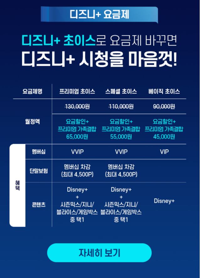이 경우 인터넷과 결합상품으로 사용하면 더 가격이 저렴해지고, 결합상품으로 3년 약정할 경우 최대 월 22,000원 가량까지 낮아진다. 만일 디즈니플러스에 진심이고 이미 LGU+ IPTV와 인터넷 결합상품을 사용 중이라면 이 요금제를 통해 디즈니플러스 구독권을 함께 받을 수 있다.