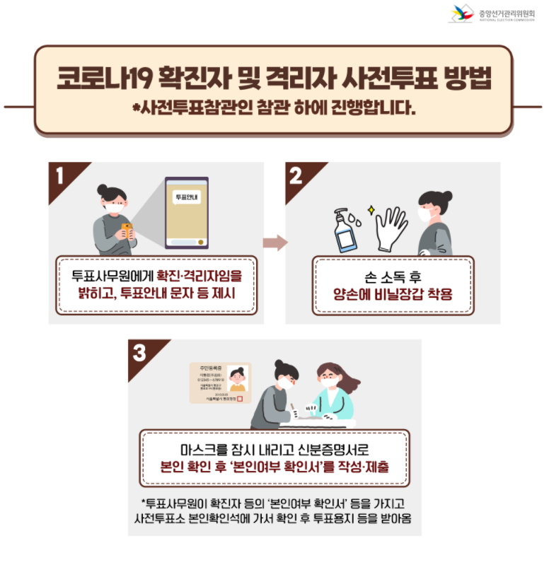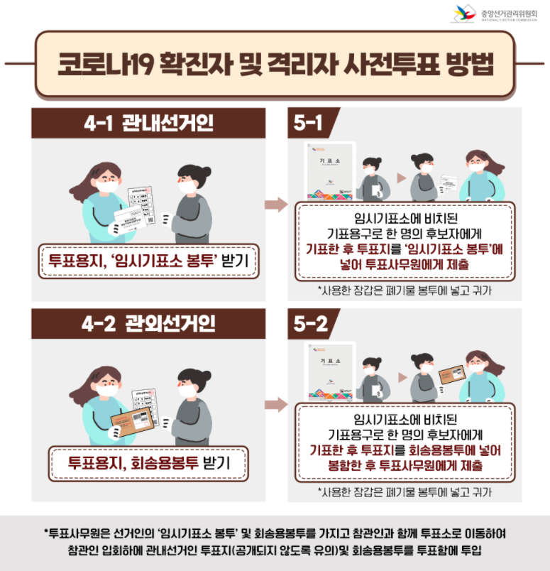 한편, 코로나 확진으로 자가격리 중이거나 기타 격리 대상자인 유권자의 경우에도 사전투표에 참여할 수 있다. 3월 5일 하루에 한하여, 보건소가 통지한 외출허용시간부터 18시 전까지 사전투표소 도착하면 투표를 할 수 있다. 즉, 일정한 조건 하에 코로나 확진자도 사전투표가 가능하다.