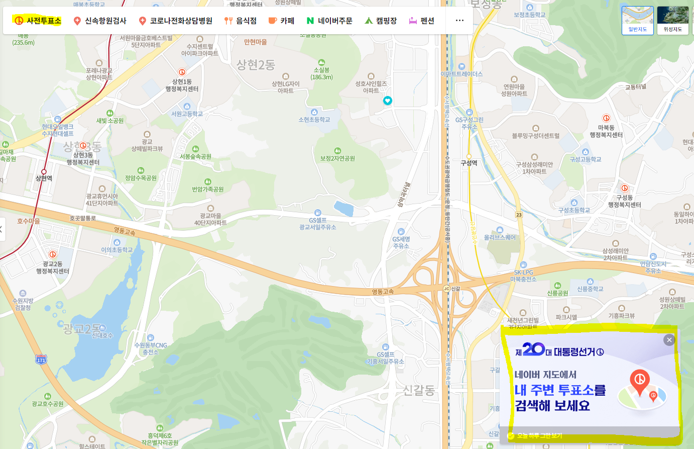 일단 네이버 지도에 접속하면, 좌측 상단에 사전투표소 검색 버튼이 있고, 우측 하단 배너를 통해 자신의 주위 사전투표소를 검색할 수도 있다.
