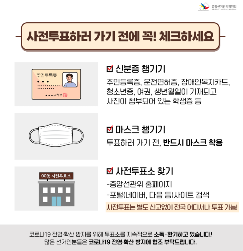 또, 사전투표는 반드시 주민등록증에 등록된 주소지 관할이 아니어도 어디서든 가능하다. 따라서 시간이 없다면 집 근처가 아니라 약속에 나가는 길이나 회사 근처의 사전투표소를 이용해도 무방하다.