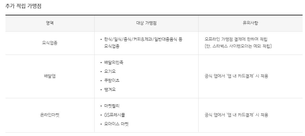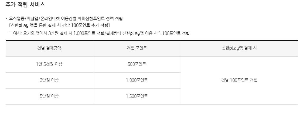 - 추가 적립: 일정한 요식업종에서 결제시 추가 적립 혜택을 주고, 특히 신한Play앱을 이용해 결제시 100원씩 추가 적립 혜택: