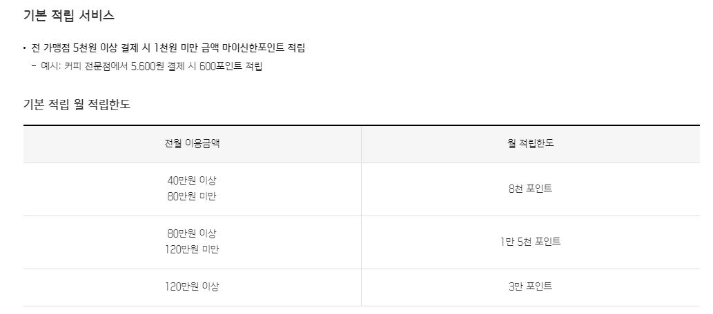 기본적으로 5,000원 이상 결제시 1,000원 미만의 끝전을 모두 현금처럼 전환 가능한 마이신한포인트로 적립해 주고, 요식업종이나 온라인 마켓 앱 등에서 결제시 끝전 단위가 아니라 1,000원 이상을 추가적립해 주는 카드다.