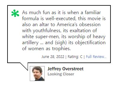 탑건에 대한 평점은 ★★★★☆. 아주아주 극히 일부지만 무려 35년전의 원작을 보지 않으면 페널티를 받는 구간이 일부 존재한다. 사실 그 부분을 떼놓고 봐도 훌륭한 영화임은 분명하므로 너무 인간미없어 보이지 않게 별 반개만 뺀다.