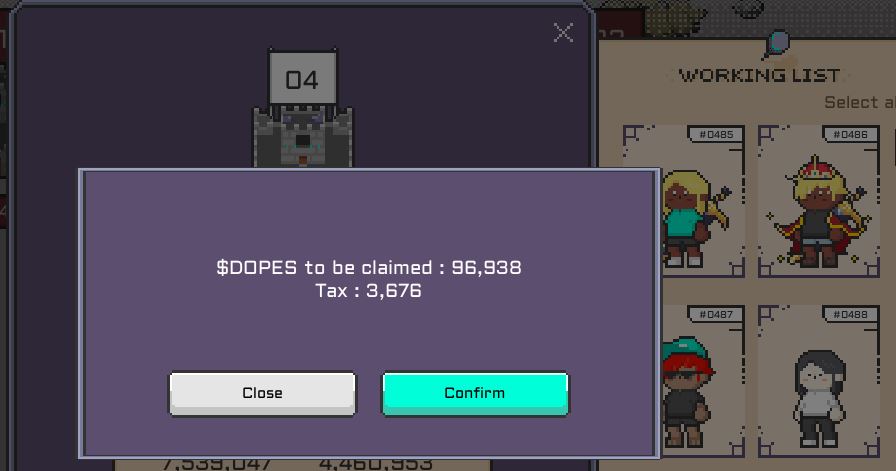 일을 하는 동안 해당 NFT는 스테이킹 상태가 되어 이를 오픈씨 등에서 판매하거나 이전할 수 없게 된다. 내가 나중에 해당 NFT를 성에서 빼내면(=언스테이킹) 비로소 일에서 해방되면서 퇴직금처럼 $DOPES를 얻을 수 있다.