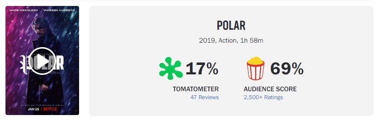 폴라의 평점은 ★★☆. 매즈 미켈슨의 사실상 단독 주연작에 흥미로운 캐릭터 등의 요소는 많지만, 오직 그것뿐이다. 단지 19세 등급의 잔혹한 액션 영화를 보려면 다른 선택지가 더 많을 것이다.