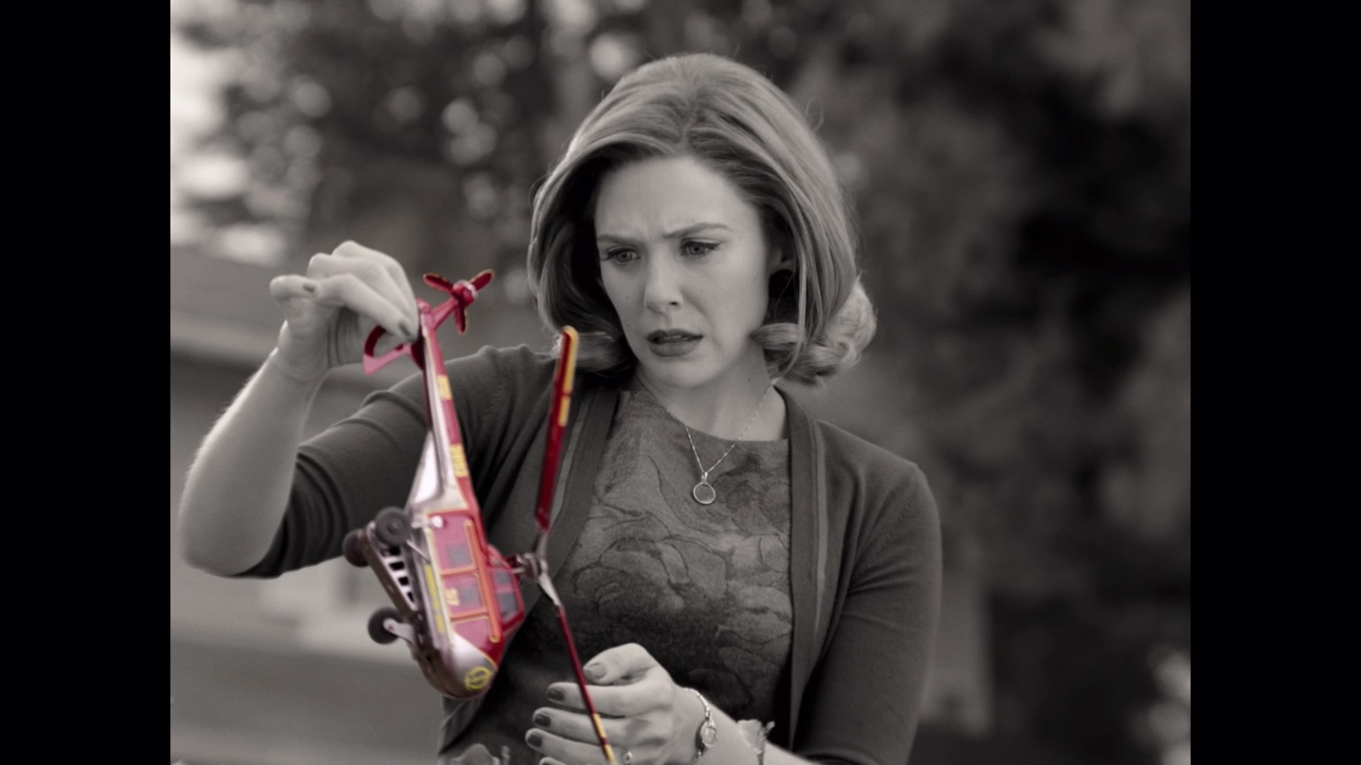 공연 연습 후 비전은 집을 나서고, 완다는 모든 것이 흑백인 가운데 집 앞에서 이상하게 컬러로 빛나는 장난감 헬기를 마치 흉물스러운 동물의 시체라도 되는 것처럼 집어들며 이상하게 생각하는 완다.